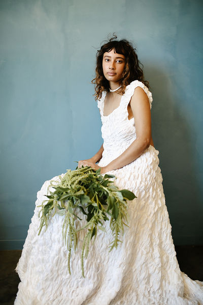 Over 10 metres of papery silk have been hand shirred to create a unique texture. Named for its lightness and volume, fold upon fold of silk habitae fall in uneven gathers to floor. The asymmetrical construction brings a contemporary feel to an otherwise traditional silhouette.