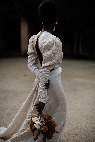 The fabric of the crystalline gown has been hand textured to create beautiful crystalline shapes that enhance the natural iridescent characteristics of the silk dupion... with frayed raw edges that gently feather the skin and sculptural puff-sleeves it is a beautiful juxtaposition of delicate and bold.
